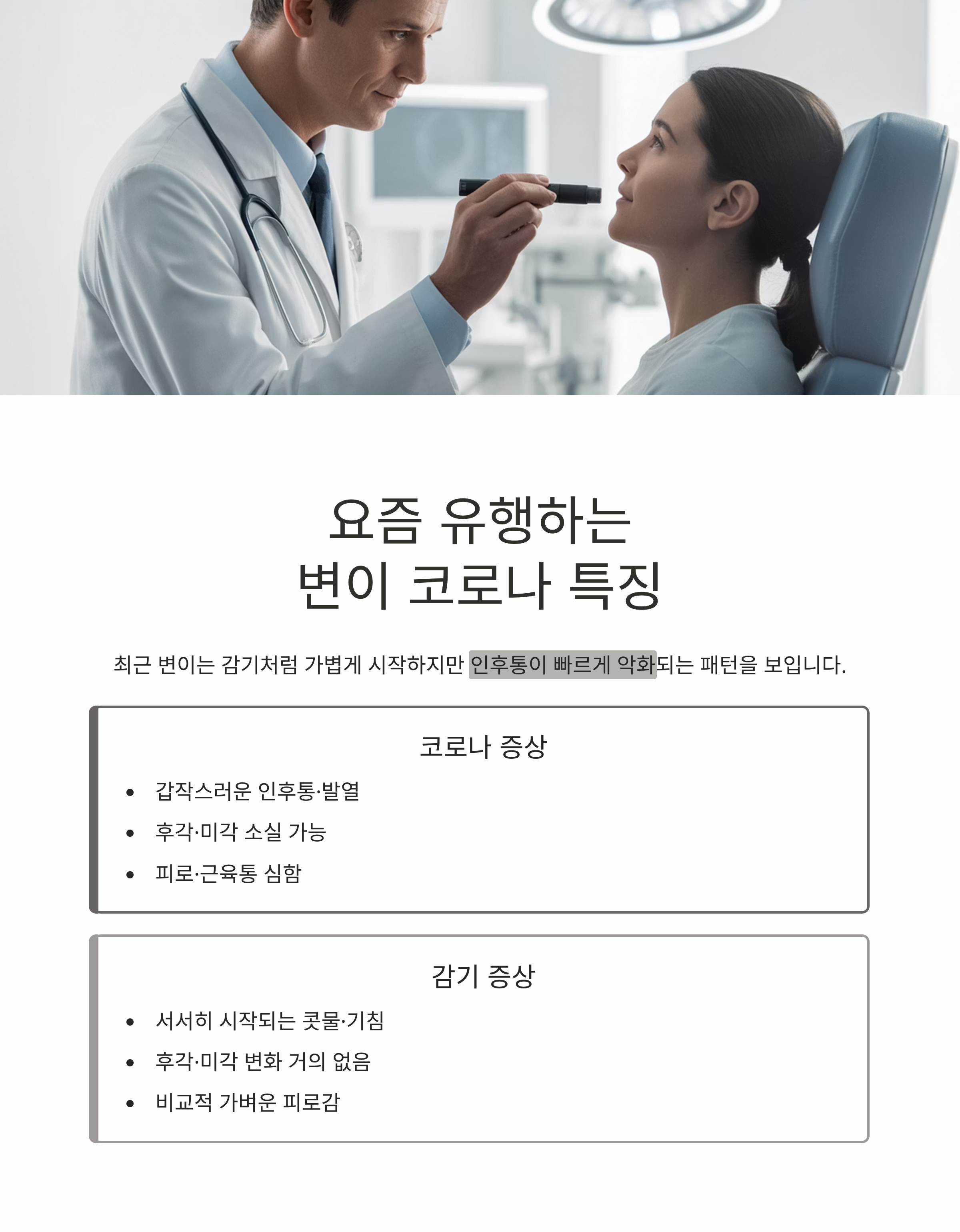 최근 보고되는 변이는 감기처럼 가볍게 느껴지는 첫 증상과 달리, 인후통이 빠르게 악화 되는 패턴이 많습니다. 기침도 길게 이어지고, 쉰 목소리가 지속되는 경우도 늘고 있어요. 콧물보다 목의 통증이 먼저 찾아온다면 코로나를 의심해야 합니다.