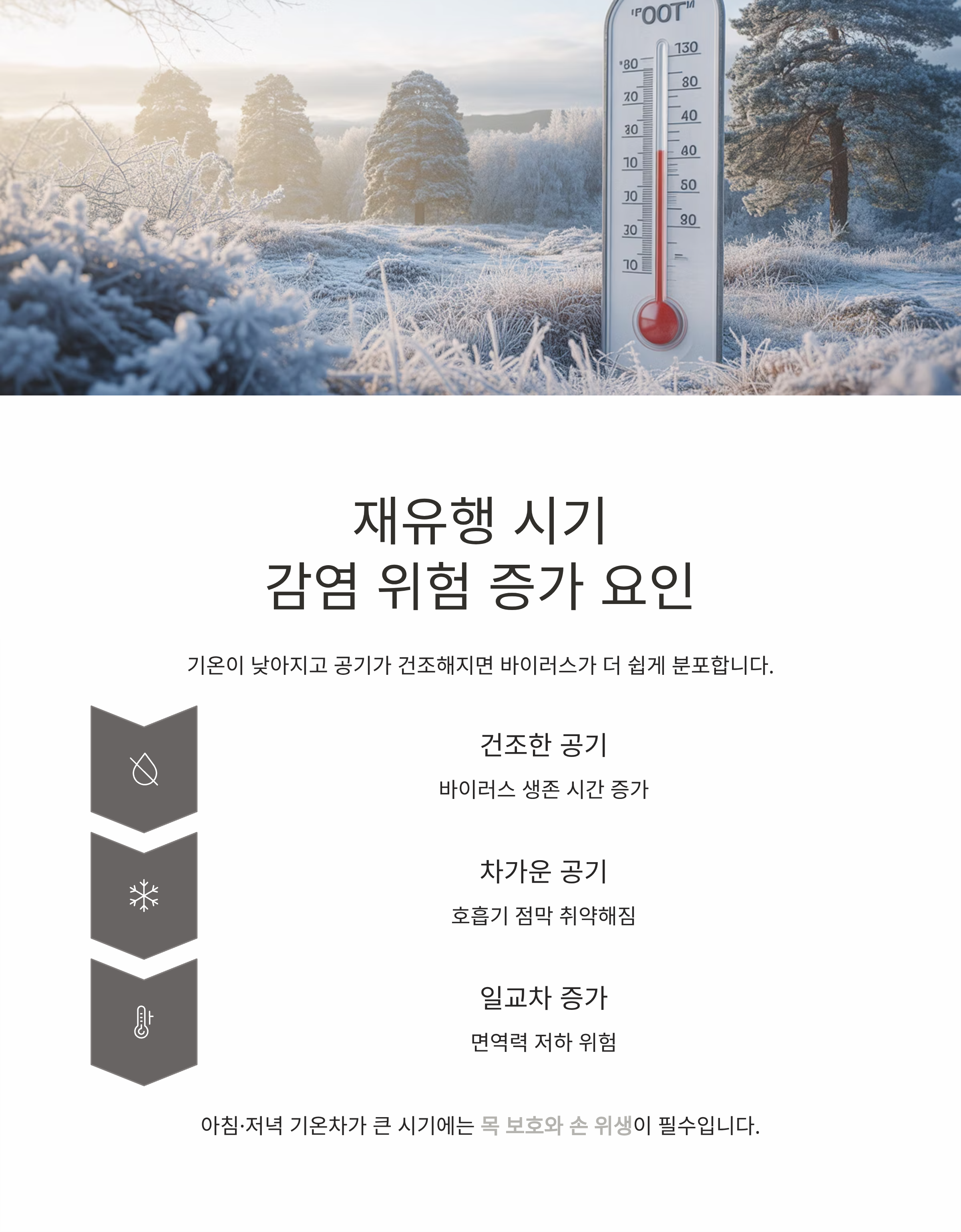 기온이 낮아지고 공기가 건조해지면 바이러스가 더 쉽게 분포합니다. 아침·저녁 기온차가 큰 시기에는 인후 점막이 약해져 감염 취약성이 높아지는 만큼 목 보호와 손 위생은 필수예요.