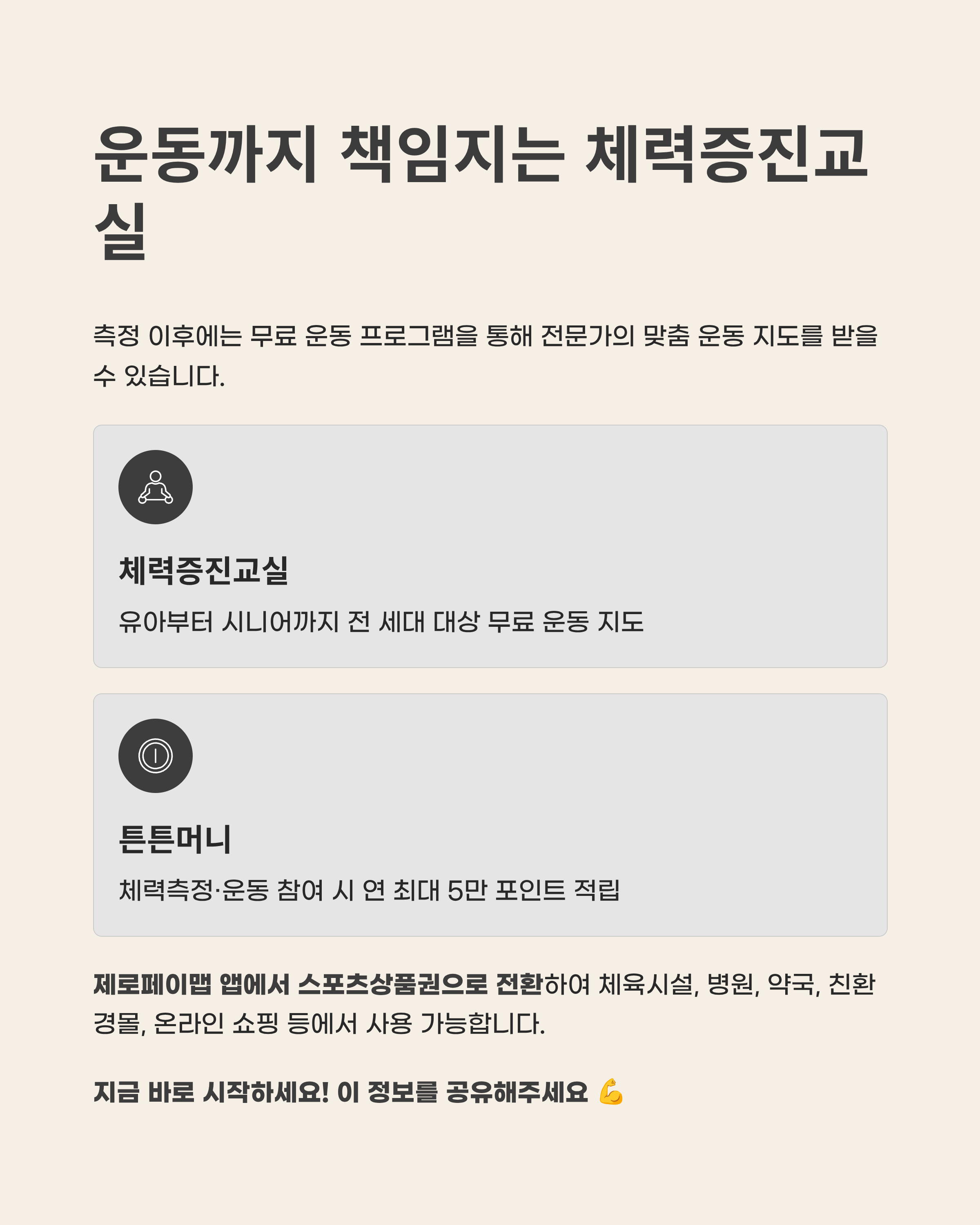 측정 이후에는 무료 운동 프로그램(체력증진교실)을 통해 전문가의 맞춤 운동 지도를 받을 수 있습니다.