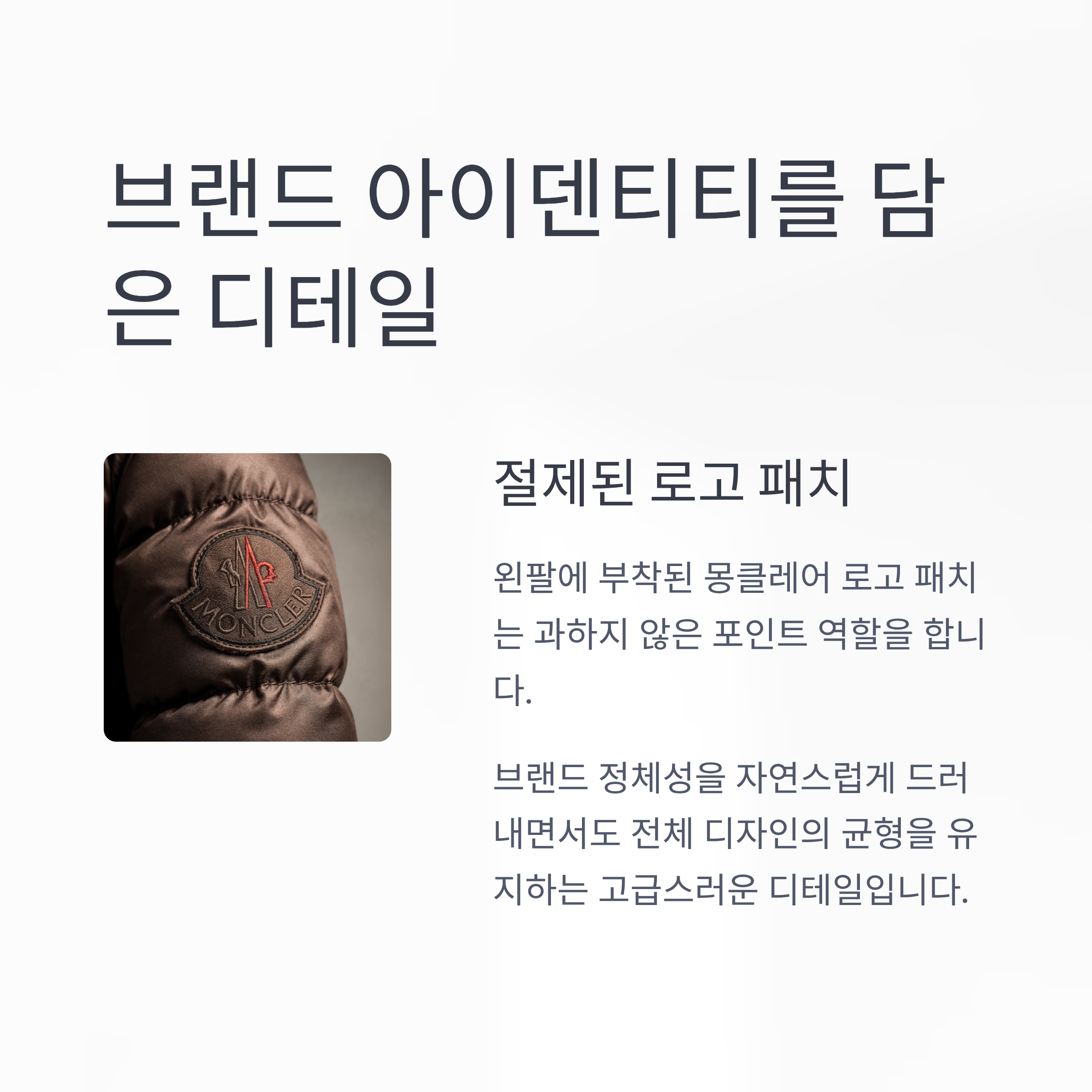 왼팔에 부착된 몽클레어 로고 패치는 과하지 않은 포인트 역할을 하며 아보체의 고급스러운 무드를 완성합니다.