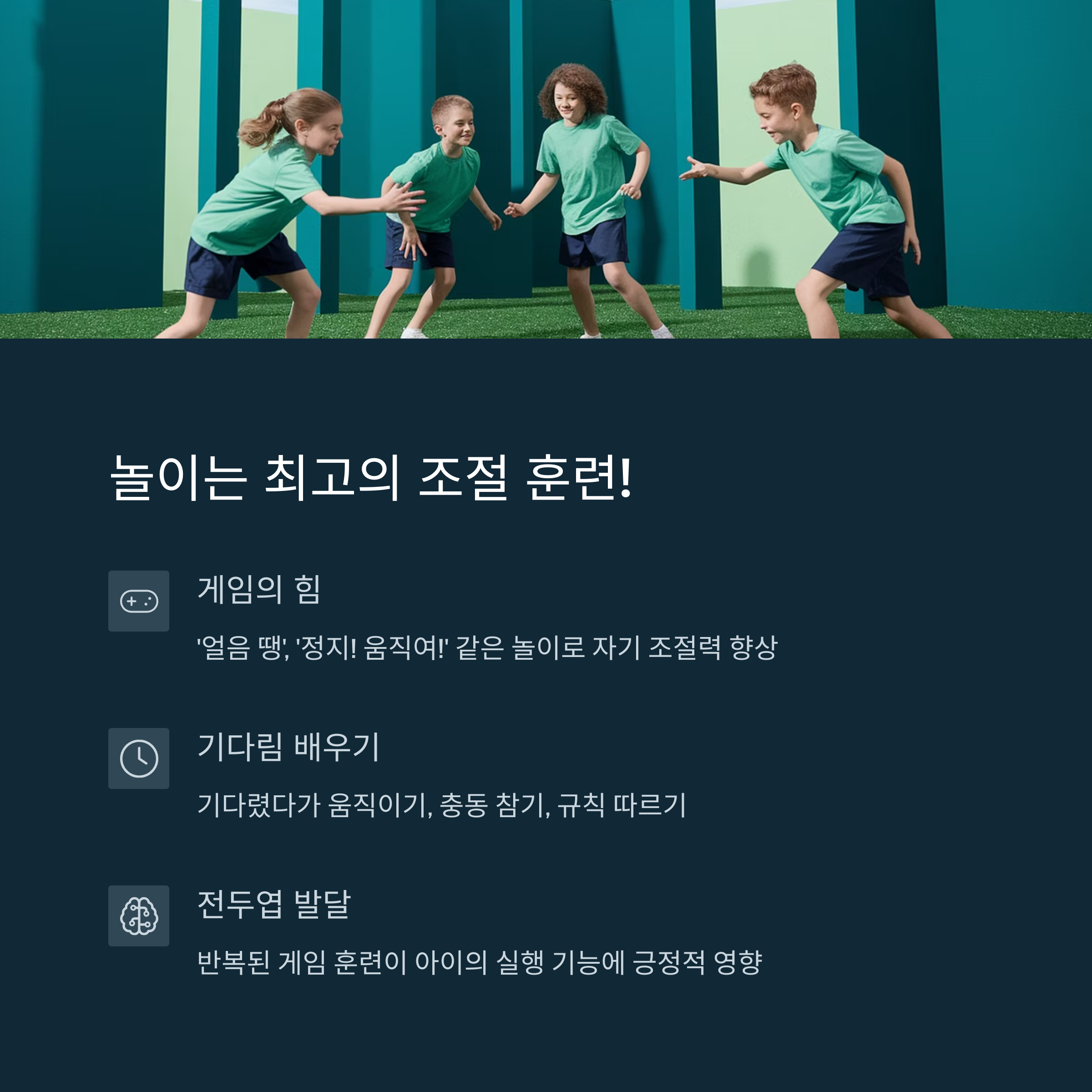 ‘얼음 땡’, ‘정지! 움직여!’ 같은 게임은 재미 속에서 자기 조절력을 훈련시켜요. 기다렸다가 움직이기, 충동 참기, 규칙 따르기 같은 능력이 놀면서 길러지는 거죠. 실제로 반복된 게임 훈련은 아이의 실행 기능(전두엽 활동)에 긍정적인 영향을 미친다고 알려져 있어요.