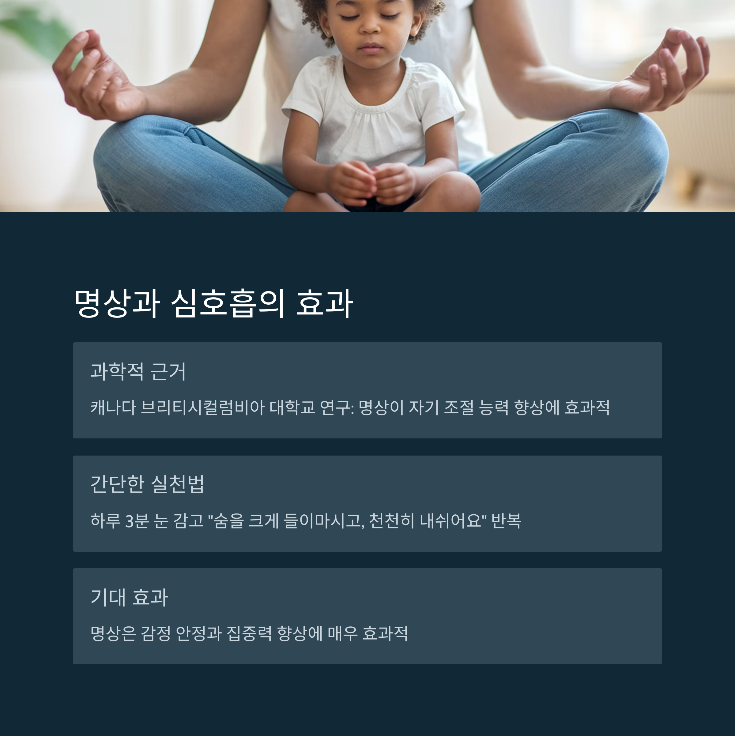 캐나다 브리티시컬럼비아 대학교의 연구에 따르면, 명상은 아이의 자기 조절 능력 향상에 효과적입니다. 하루 3분만 눈을 감고 “숨을 크게 들이마시고, 천천히 내쉬어요”를 반복해 보세요. 아이와 함께 조용히 앉아 심호흡을 하는 시간, 그 자체가 큰 훈련이 됩니다. 명상은 감정 안정과 집중력 향상에 매우 효과적입니다.