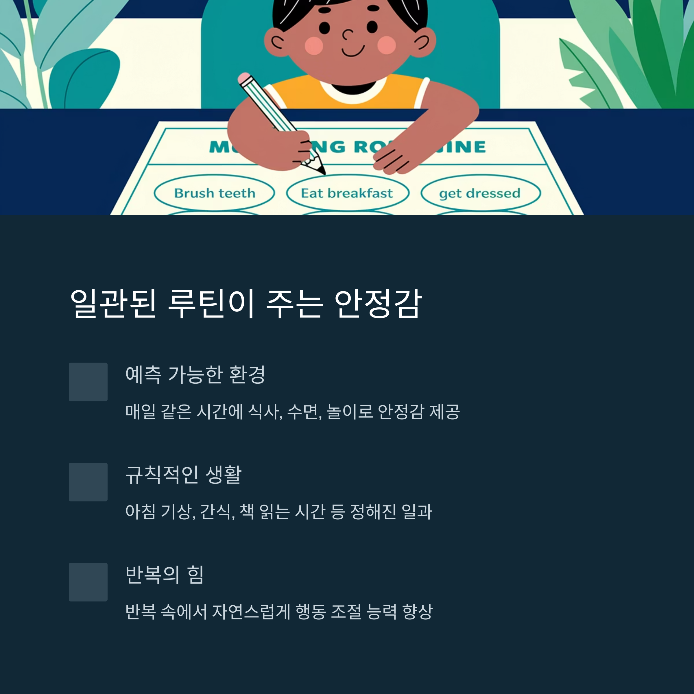 예측 가능한 일상은 아이의 자기 통제력을 키워줍니다.