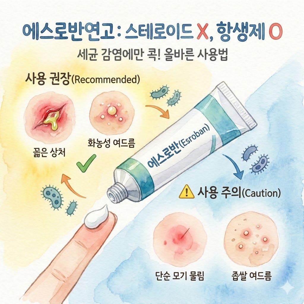 에스로반연고는 스테로이드가 없는 항생제 연고로, 세균 감염 예방·관리 목적 에 초점이 맞춰진 약입니다.