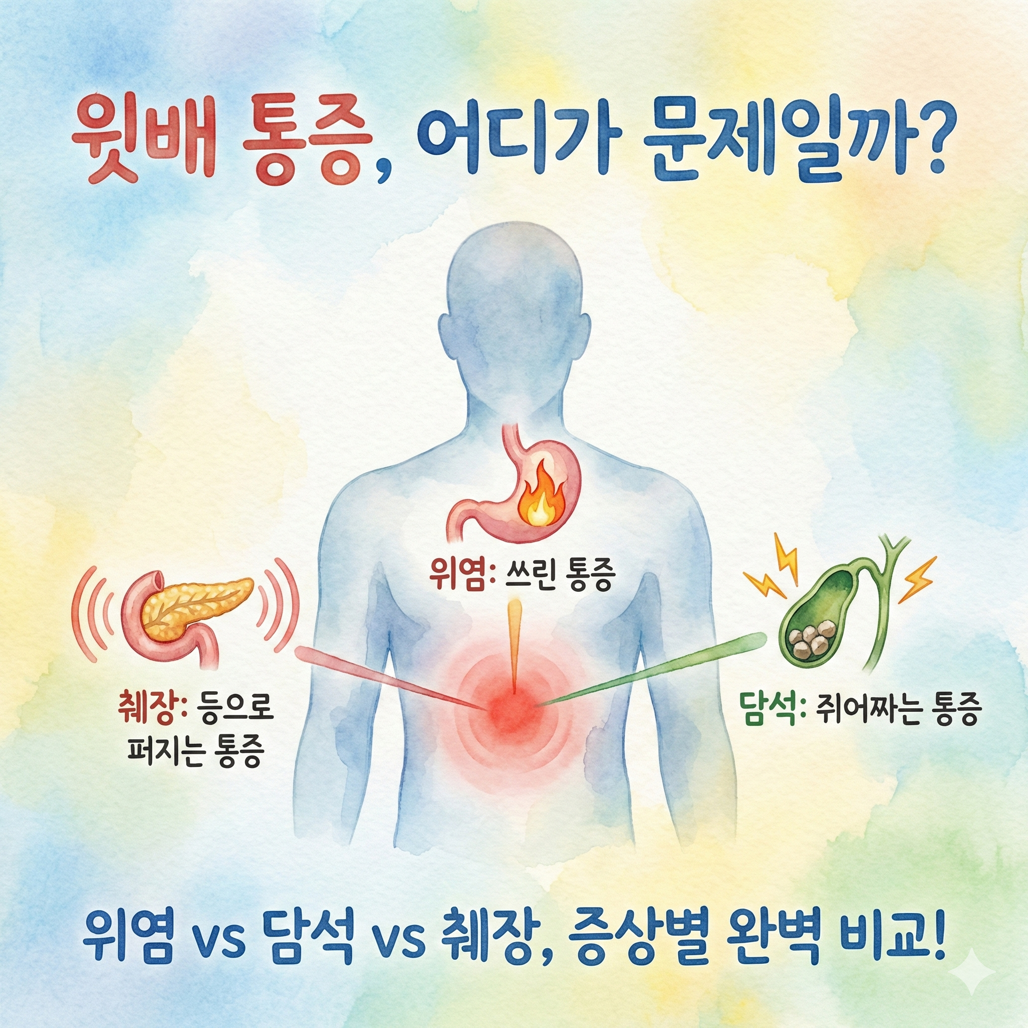 정리해보면 통증의 위치·강도·동반 증상에 따라 어느 장기를 의심해볼지 달라질 수 있습니다. 위염, 담석, 췌장 관련 증상을 비교해보고, 상황별로 어떻게 대처하면 좋을지 차분히 살펴보겠습니다.
