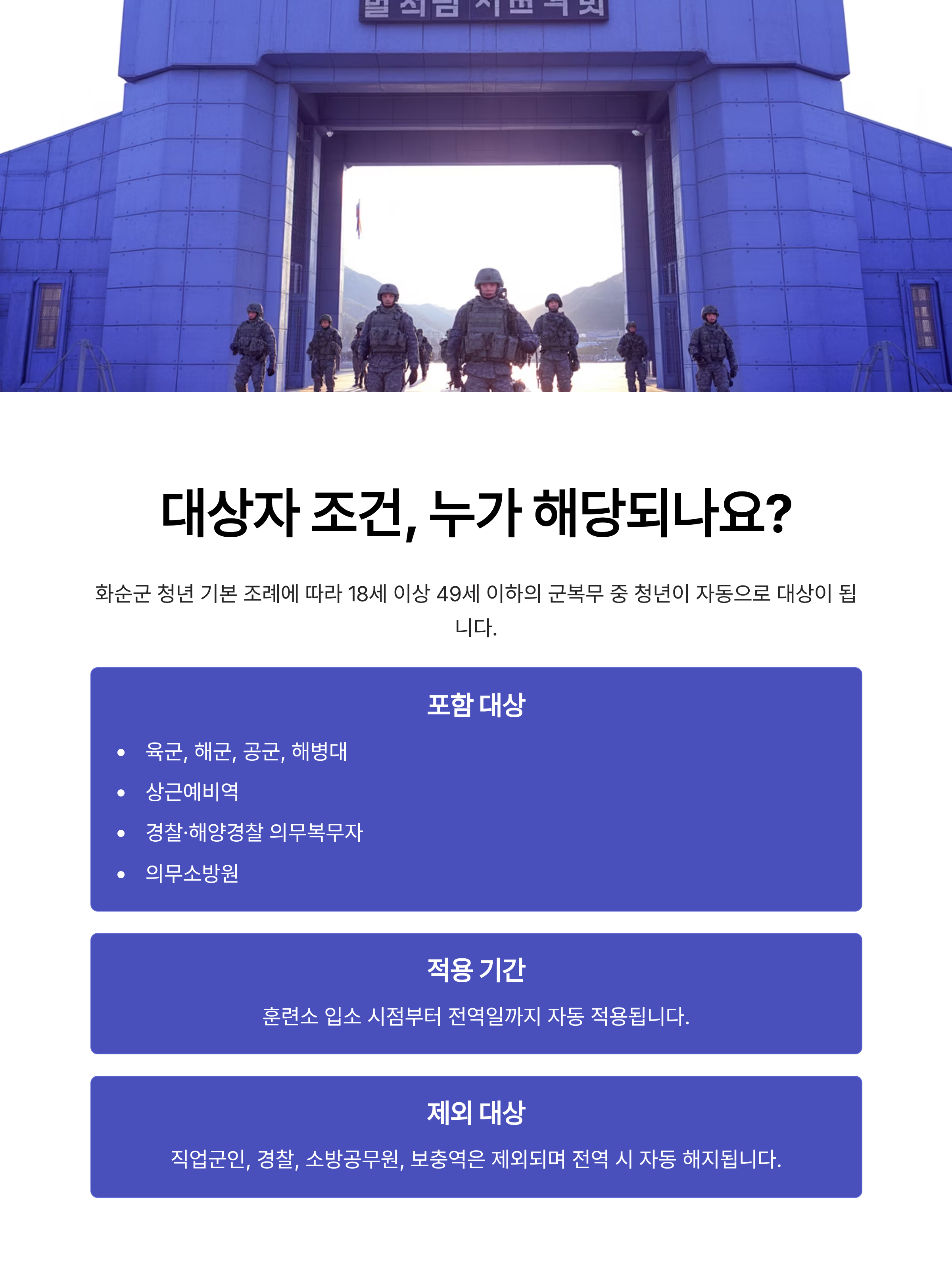 화순군 거주 청년은 입대 시점부터 자동 적용되며, 전역 시 해지됩니다.