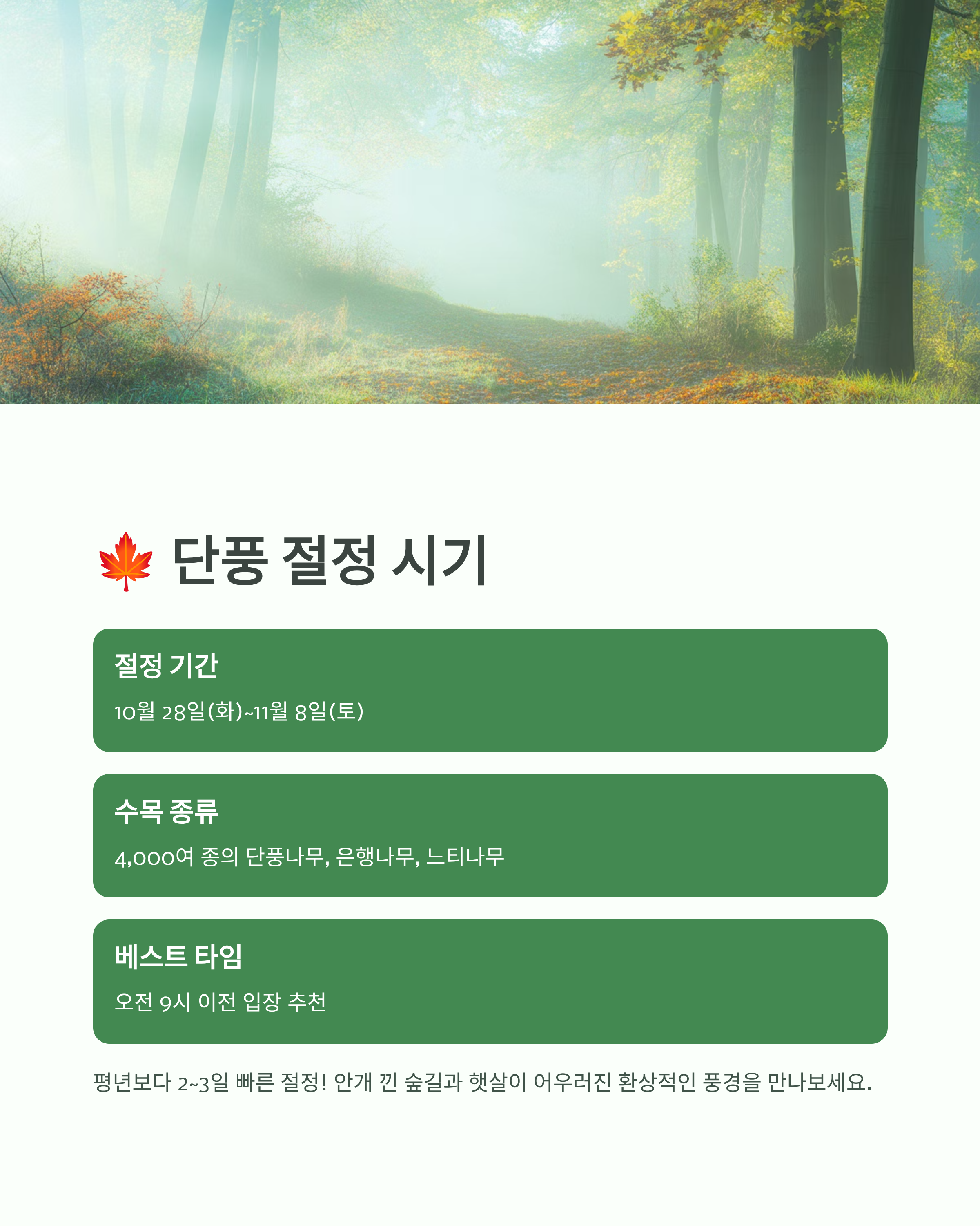 기상청과 경기관광공사의 단풍 지도에 따르면, 올해는 일교차가 커지면서 평년보다 2~3일 빠르게 절정이 시작될 것으로 보입니다. 아침 9시 이전에 입장하면 안개 낀 숲길과 햇살이 어우러진 환상적인 사진을 찍을 수 있어 SNS 인증 명소로도 인기입니다.